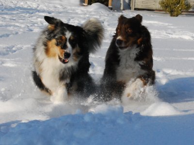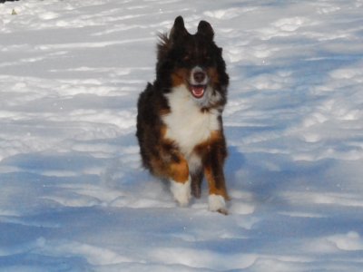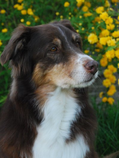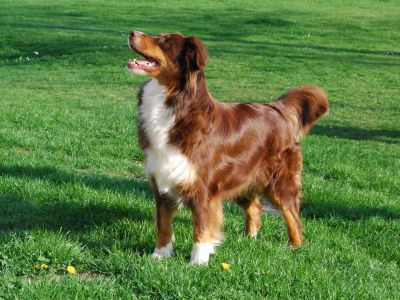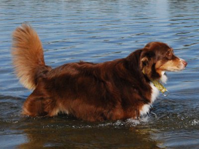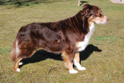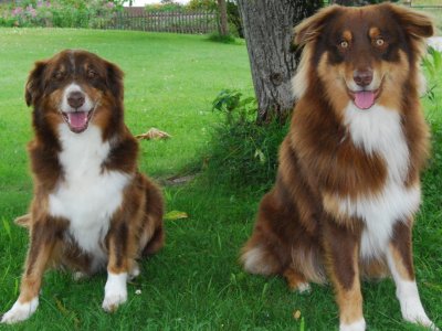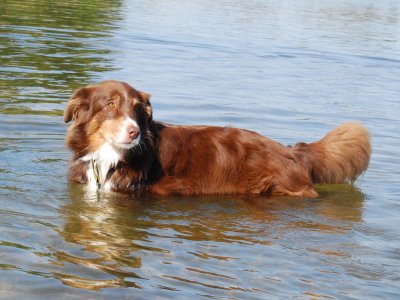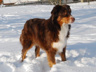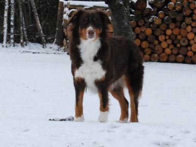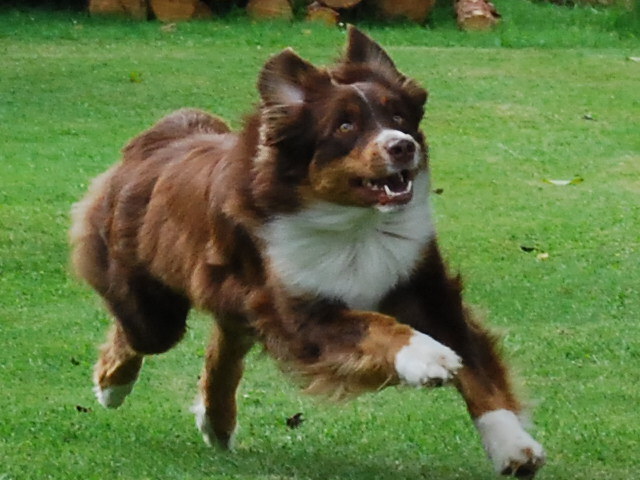 Sie kam, sah und siegte! Dieser Satz paßt zu Casca wie die Faust auf´s Auge. Von dem Tag an, als die kleine rote Hündin in unser Leben einzog war eines schnell klar: Selbsbewußtsein ist ihr zweiter Name, Unerschrockenheit ihr Nachname. In der Hundeschule angekommen, zeigte sie sich von ihrer besten Seite und hatte in Null komma nix die Komandos gelernt. Nachdem Casca aus der Welpengruppe rausgewachen und somit zu den Junghunden kam, wurde schnell klar, dass die Pupertät eine Geduldsprobe werden würde. Bei einem Ohr rein beim anderen raus, das war von nun an einige Zeit unser Motto. Da es den anderen auch nicht viel besser ging, hielten auch wir tapfer durch und wurden schließlich mit einer erwachsenen Hündin belohnt, die ihre Begleithundeprüfung mit einem I. Platz abgeschlossen hat und in der Hundeschule immer eine tadellose Leistung abgibt. Von Casca haben wir viel über "Hundesprache" gelernt. Ihre Mimik und Körpersprache scheint grenzenlos zu sein. Allein ihr "Aussie-Lächeln" reicht von einem kurzen Lefzen hochziehen zur Begrüßung, bis zum vollständigen Entblößen der Zähne, bei ausgelassener Freude. Bei Nichtkennern dieser vom Menschen abgeschauten Mimik hat dies schon des öfteren für entsetzte Blicke gesorgt. Allerdings einmal gesehen, versucht Jeder sie wieder zum Lächeln zu bringen. Seit sie ihren ersten Wurf großgezogen hat, liebt sie Welpen über alles, und würde wahrscheinlich sämtliche Babies adoptieren. Ihre Lieblingsbeschäftigung, außer natürlich den sowieso wichtigen Dingen, wie freßen und schlafen, ist vor allem das Spielen mit ihrer Tochter Sky. Besonders gerne begleitet uns Casca bei Ausritten mit unseren Pferden oder läuft begeistert neben dem Fahrrad her. Ach ja, beim Fußballspielen ist sie unseren Zweibeinern souverän haushoch überlegen. Seit Anfang 2011 ist auch Casca unter die Mantrailer gegangen und zeigt sich dort als echtes Naturtalent. Selbsverständlich ist sich Casca iher Schönheit voll und ganz bewußt und setzt sich immer gekonnt in Pose. Je meht Zuschauer desto besser. Ihr wahnsinniges Gangvermögen kommt ihr auf jeder Ausstellung zu gute. Mit ihren Bernstein-Augen zieht sie uns jeden Tag auf Neue in ihren Bann. Eine Aussie-Liebe eben! Nachdem 2012 ihr dritter, und somit letzter, Wurf geboren wurde, können wir stolz Bilanz ziehen: 15 Welpen die alle putzmunter durch unkomplizierte Geburten zur Welt kamen, und die sie hervorragend und sehr instinktsicher aufgezogen hat.