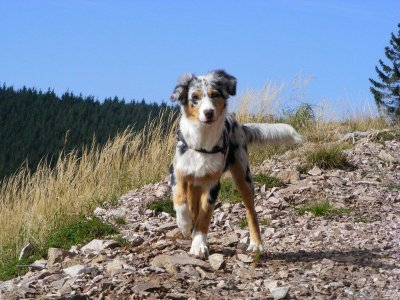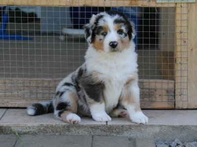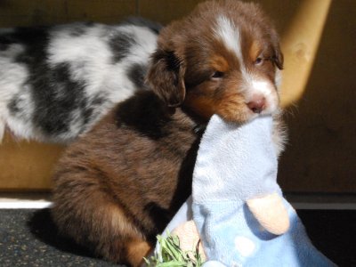 Poker hat auch helles Merle, und wird von der Schwarz-Zeichnung her, in die Richtung von seiner Tante Skyline gehen. Er hat schon wunderschönes kräftiges Kupfer, und seine einseitige schwarze Kopfmaske macht ihn zum perfekten Poker-Face! Aus Poker wird in Zukunft Rocky, obwohl er eine absolut sanfte Seele ist, und ihm eine Schmuserunde viel lieber ist als eine Runde im Ring! Mit seinen verschiedenen Augen, eins hellblau und eins dunkelbraun, wird er bestimmt ein Eyecatcher dem keiner wiederstehen kann.