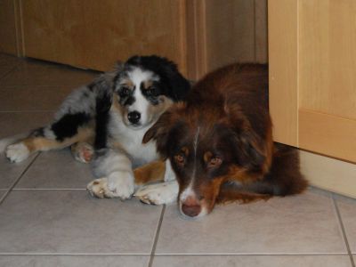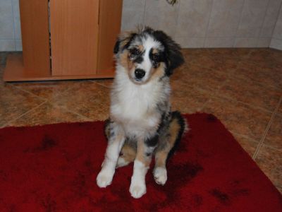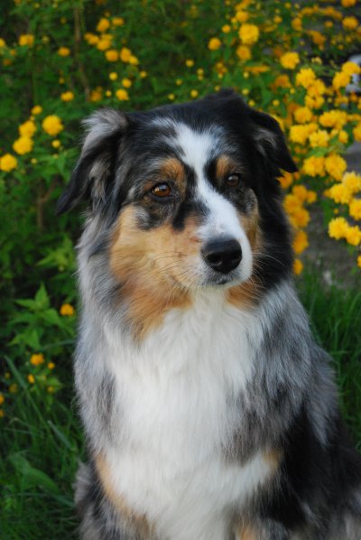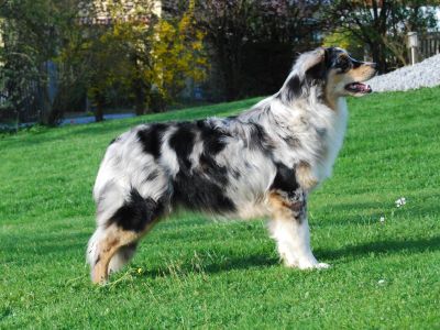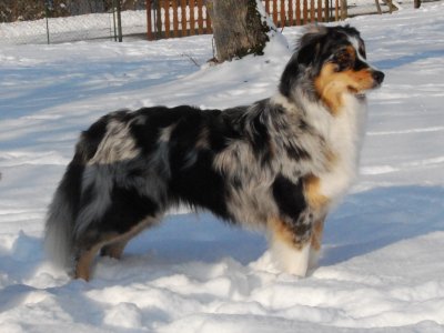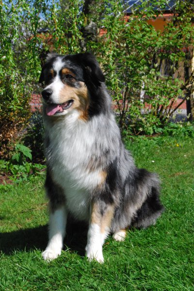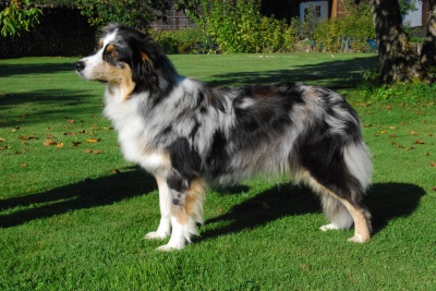 Hündin geb. 06.08.2008 Farbe: Blue-Merle w/c Augenfarbe: braun Größe: 53 cm Gewicht: 20 kg lange Rute HD: B1 ED: Grad 0 Augen frei von erblichen Krankheiten korrektes und vollständiges Scherengebiss DNA: VP MDR1: +/-