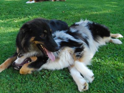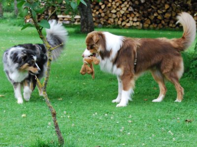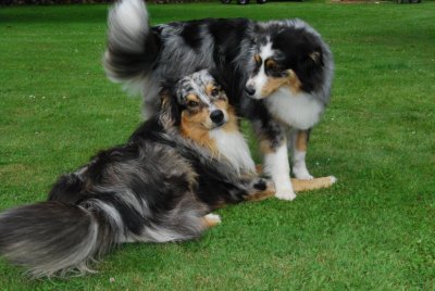 Endlich der erste Wurf von Casca, und natürlich kam das Unvermeidliche: Das kleine Blue-Merle Mädchen mußte einfach bleiben. Kaum waren die Augen offen, hängte sie sich unverzüglich an Frauchen und bombardierte sie mit Schmachtblicken. Wer kann da schon wiederstehen? Wir jedenfalls nicht. Vom Wesen her sehr ruhig und ausgeglichen, auch schon im Teeniealter, harmoniert sie bestens mit Casca und unserer kleinen Mischlingshündin Peggy. Sie zeigt sich von klein an als sehr angenehme und leicht zu führende Hündin, die immer gefallen will. Mit unerem Sohn Leon aufgewachsen, liebt sie Kinder, und gewinnt die Herzen der Kleinen mit einem gekonnten Augenaufschlag und einem Bussi. Bei Erwachsenen zieht sie die Variante "auf die Füße setzen" vor, dann kann das "Opfer" nicht mehr weg. Eine Schmusebacke durch und durch. Je älter Sky wird, desto mehr zeigt sich, dass unsere Kleine eine Allrounderin wird. Longieren findet sie echt klasse, da es dabei möglich ist die unterschiedlichsten Aufgaben und Anforderungen zu stellen, und es somit nie langweilig wird. Über das Longieren haben wir mittlerweile auch mit den Grundzügen der Hütearbeit an Schafen angefangen. Bisher läuft es recht gut, mal schaun wie´s weitergeht. Eine andere Aufgabe, die Ihr anscheinend auch ziemlich gut liegt, ist das Mantrailing. Wir sind gespannt was sie uns in Zukunft noch so alles zeigen wird!
