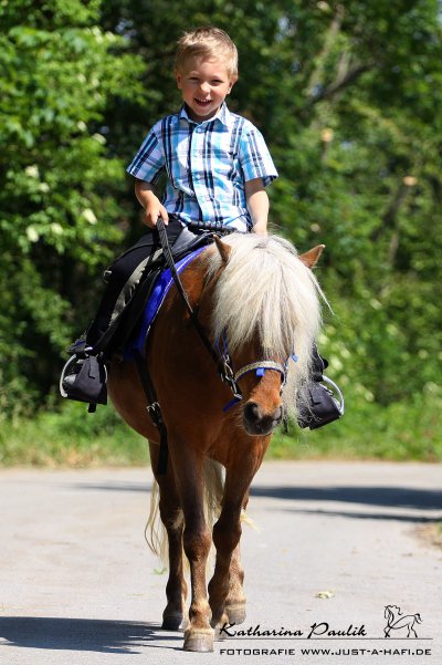 Unser Sohn Leon auf dem Mini-Shetty Cincano und seiner Tante Jenny!