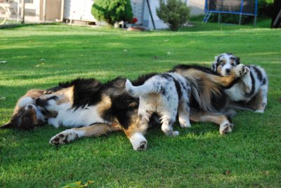 Ich kann nur sagen es stimmt: Hat man einen Aussie bleibt´s meist nicht bei einem, in unserem Fall nicht bei zweien. Schon lange war der Gedanke verlockend "So ein Rüde wär schon ganz gut in unserem Mädelsrudel". Als dann Skys erster Wurf zur Welt kam und unser Sohn Leon beim ersten Begutachten der Welpen sofort sagte: "Der Schwarze gehört mir, den geb i net her", waren wir ja noch ganz enspannt. Die Kleinen wurden immer größer und auch uns gefiel er immer besser. Dann kamen die ersten Besucher und irgendwann haben wir dann beschlossen, er bleibt, den geben wir nicht mehr her. Walker bestätigt alle, die von einem Rüden behaupten, die seien unheimlich verschmust. Vom Kuscheln kann er überhaupt nicht genug bekommen! Er ist unglaublich clever und bisher sehr leicht zu führen. Da er sehr ausgeglichen und ruhig ist, paßt er perfekt in unser kleines Rudel.